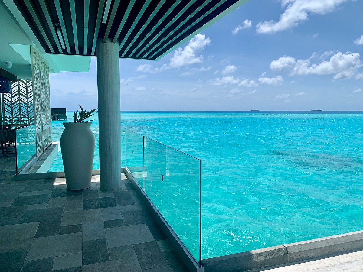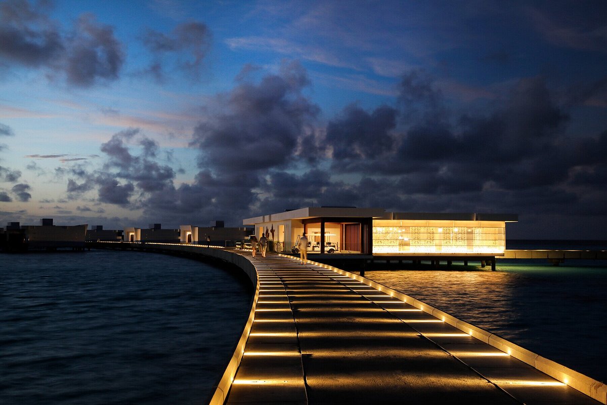 سوئیتهای روی آب هتل دارای تراسهایی هستند و برخی از آنها حتی دارای استخرهای خصوصی میباشند. امکانات هتل شامل رستورانهای متنوع، از جمله یک رستوران بوفه غیررسمی و یک رستوران ژاپنی مدرن، چندین بار آرامشبخش، اسپا، باشگاه ورزشی و استخر روباز است.